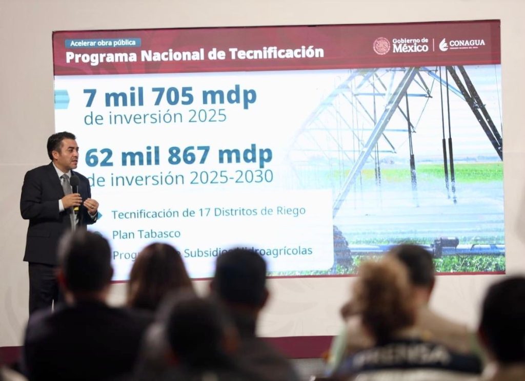 Señaló que para el Programa Nacional de Tecnificación de Riego la inversión programada para el periodo 2025-2030 es de más de 62 mil 860 mdp, los cuales serán destinados a tecnificar 17 distritos de riego, el Plan Tabasco y el Programa de Subsidios Agrícolas.