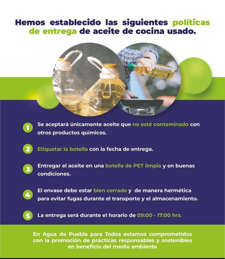 De esta manera, se invita a la población a no arrojar el aceite vegetal usado al drenaje y colaborar con esta noble causa, acudiendo a donar los residuos de su aceite, en botellas de plástico y entregarlo en cualquiera de las sucursales de Agua de Puebla.