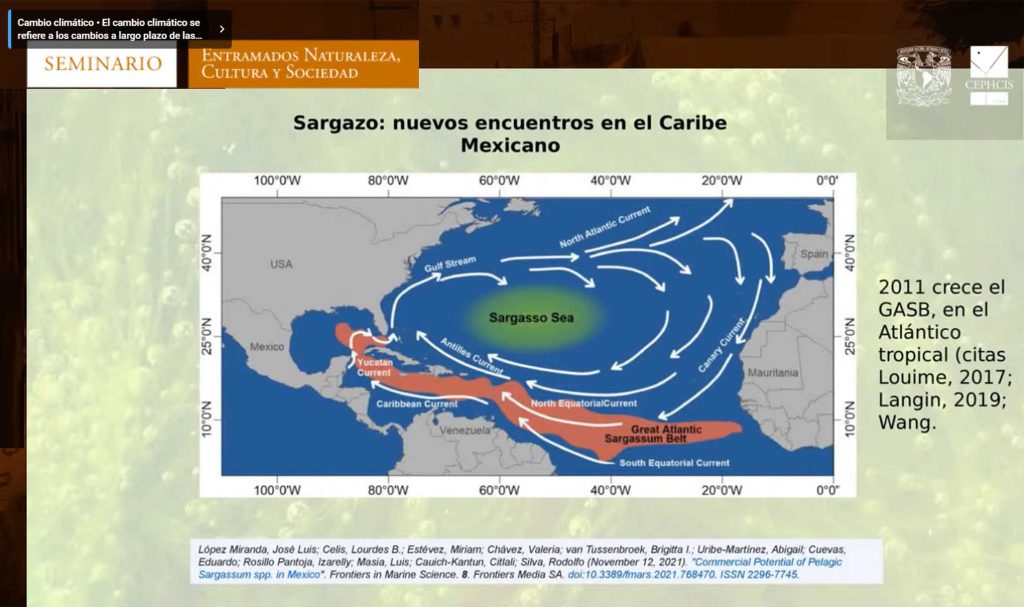 Al participar en el Seminario Interinstitucional Entramados Naturaleza, Cultura y Sociedad, del Centro Peninsular en Humanidades y Ciencias Sociales, con sede en Mérida, Yucatán, explicó que 2022 fue un año de abundante llegada de esta alga, un nuevo actor en el Caribe mexicano.