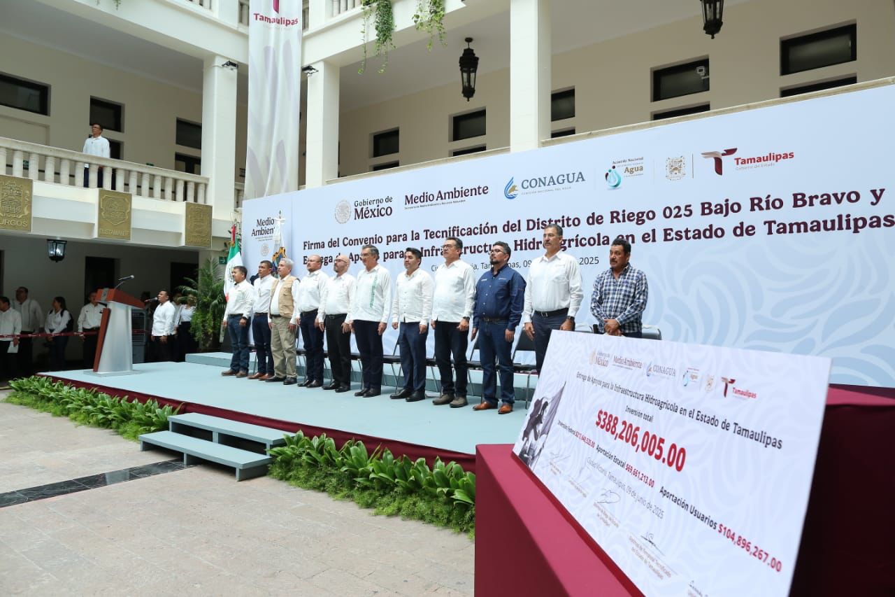 El Gobierno de México, mediante la Comisión Nacional del Agua (Conagua), en coordinación con el gobierno de Tamaulipas y los usuarios, tecnificará los distritos de riego 025 Bajo Río Bravo y 026 Bajo Río San Juan, como parte del Programa Nacional de Tecnificación de Riego, una iniciativa de la presidenta Claudia Sheinbaum Pardo, enfocada en producir más alimentos con menos agua, lo cual permitirá avanzar hacia la autosuficiencia alimentaria y generar ahorros de agua para destinarlos al consumo humano.