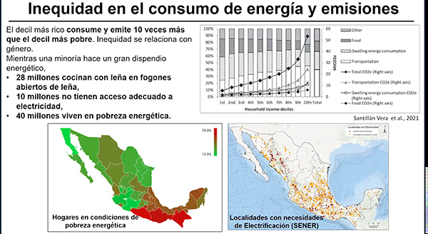 Al referirse a la relación con la inequidad en el consumo y emisiones contaminantes, dijo que el decil (método cuantitativo) de la población de mayores recursos gasta y emite 10 veces más que la más pobre. “Mientras una minoría hace un gran dispendio energético, 28 millones cocinan con leña, 10 millones no tienen acceso adecuado a electricidad y 40 millones viven pobreza energética”.