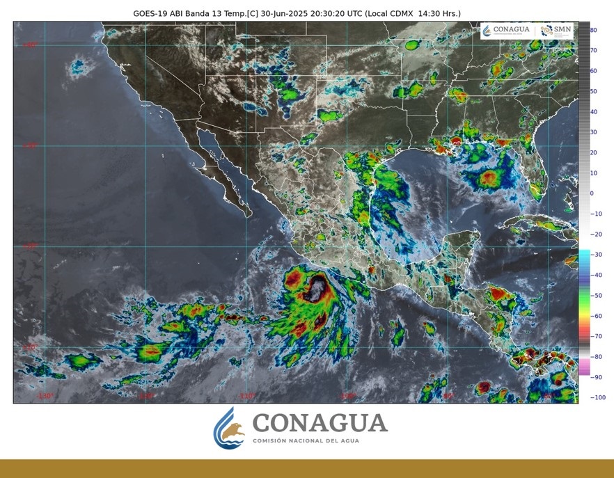Sus bandas nubosas y el arrastre de humedad que genera mantendrán el pronóstico de lluvias torrenciales (de 150 a 250 milímetros [mm]) en la costa de Guerrero; intensas (de 75 a 150 mm) en Colima, la costa y el sur de Michoacán, el oeste y el sur de Jalisco y el norte y el suroeste de Oaxaca; vientos de 60 a 80 km/h con rachas de 90 a 100 km/h en costas de Guerrero, Michoacán y Colima; de 30 a 40 km/h con rachas de 50 a 70 km/h en costas de Oaxaca y Jalisco, así como oleaje de 5 a 6 metros (m) de altura en Guerrero, Michoacán y Colima, y de 2.5 a 3.5 m de altura en Oaxaca y Chiapas.