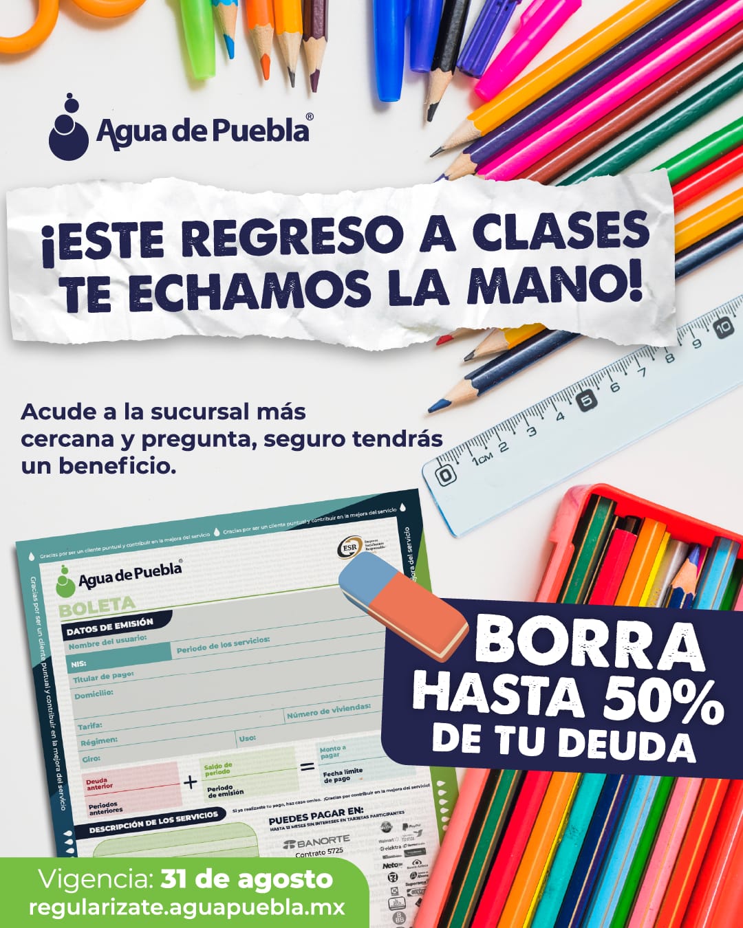 En un gesto de compromiso social y empatía, Agua de Puebla invita a todos los usuarios que aún no se han regularizado, a que no dejen pasar esta oportunidad de ponerse a corriente en sus adeudos históricos de agua potable, drenaje y saneamiento hasta con un 50% de ahorro, dirigido a familias y negocios poblanos.