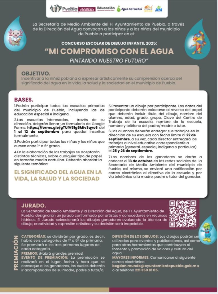 Iván Herrera añadió que la niñez poblana será la protagonista de este certamen, expresando a través del arte lo que significa el agua en su vida cotidiana y en la sociedad. “Queremos que cada dibujo sea una voz que nos recuerde la urgencia de cuidar y conservar el agua”, afirmó.