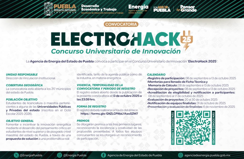 El gobierno humanista del mandatario Alejandro Armenta, a través de la Agencia de Energía del Estado de Puebla, emitió la convocatoria para el Concurso Universitario de Innovación “ElectroHack 2025”, dirigido a estudiantes de licenciatura y maestría de instituciones académicas públicas y privadas de la entidad. El objetivo es impulsar a las juventudes como agentes activos en la construcción de un futuro sostenible, mediante el ingenio, la innovación y el trabajo en equipo para desarrollar soluciones a los retos del sector energético.