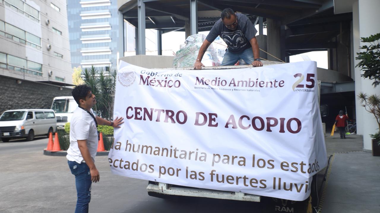 La Secretaría de Medio Ambiente y Recursos Naturales (Semarnat) entregó hoy a la Secretaría de la Defensa Nacional (Sedena), víveres y artículos de limpieza recolectados en sus centros de acopio instalados para apoyar a la población afectada por las recientes lluvias en distintas regiones del país.
