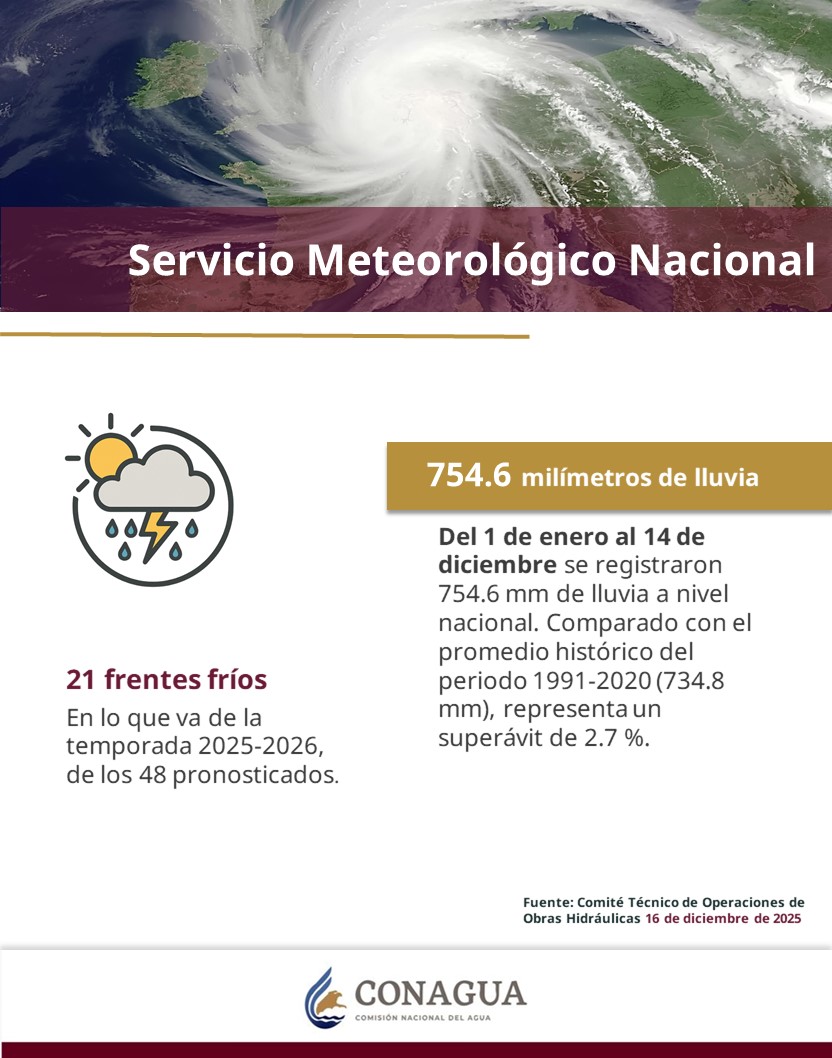 Es fundamental destacar que, la temporada de lluvias y ciclones tropicales 2025 tuvo un impacto positivo en la recuperación del almacenamiento de agua en las presas del territorio nacional. Gracias a las precipitaciones registradas entre el 15 de mayo y el 30 de noviembre, el almacenamiento nacional alcanzó un nivel máximo del 72 %, cifra significativamente superior al 64 % registrado en 2024.