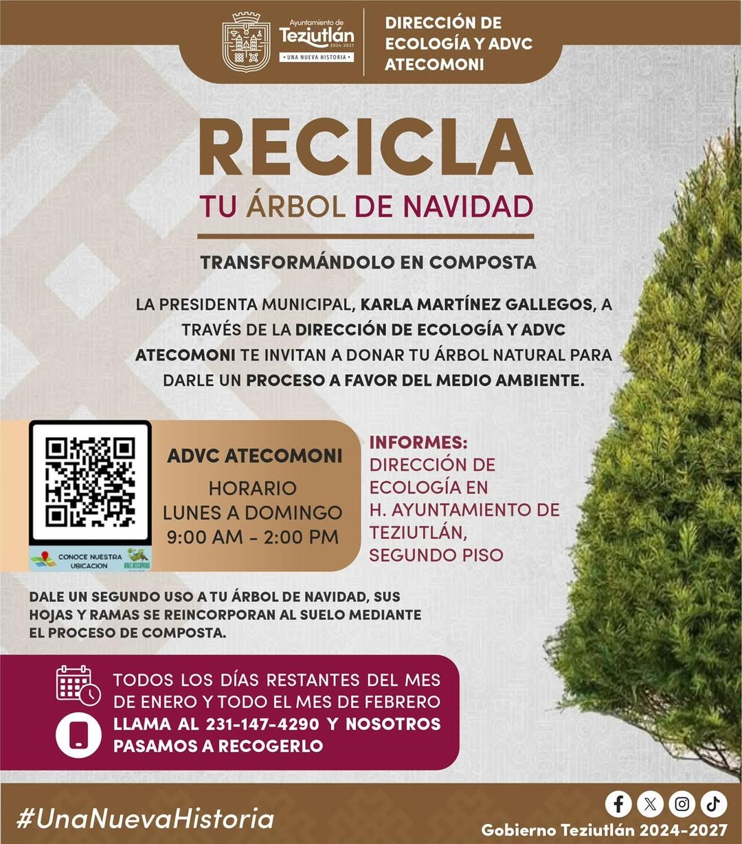La presidenta municipal de Teziutlán Karla Martínez Gallegos, a través de la Dirección de Ecología y ADVC Atecomoni, invita a la ciudadanía a reciclar su árbol de Navidad.