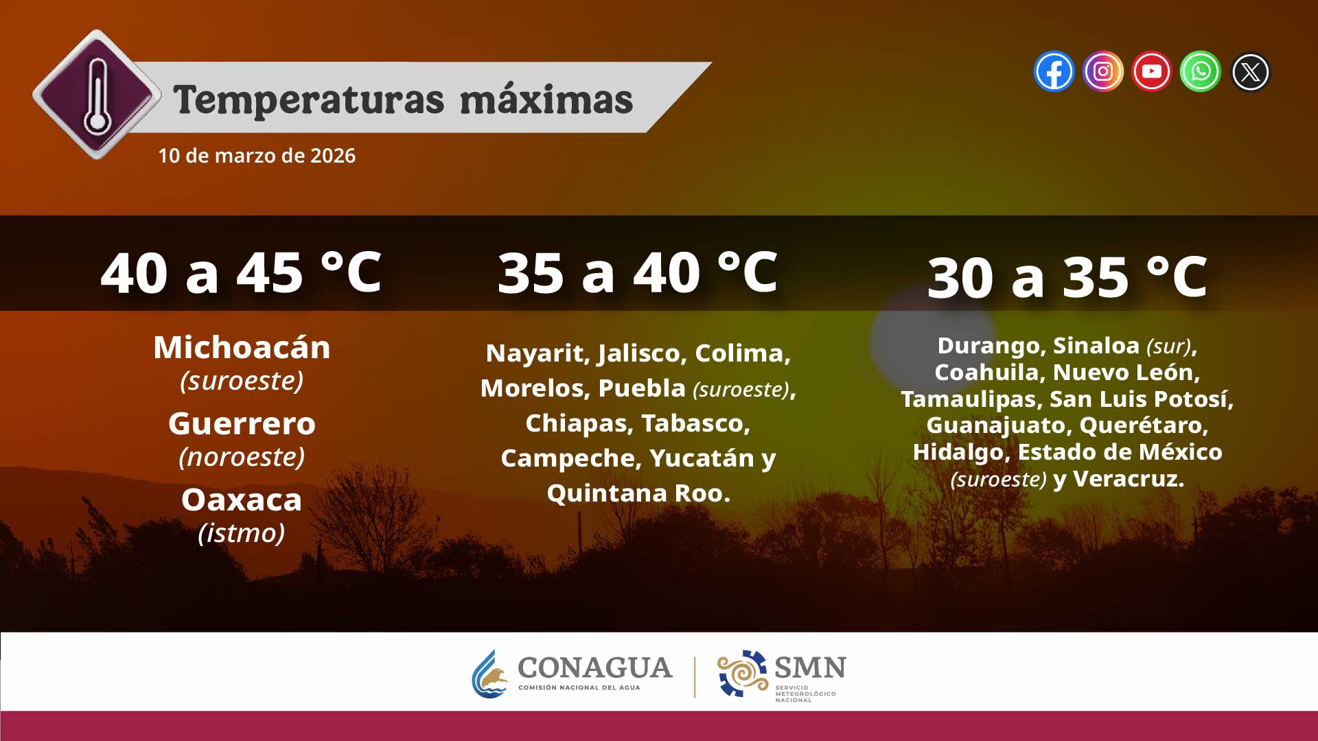 Temperaturas máximas de 40 a 45 °C: Michoacán (suroeste), Guerrero (noroeste) y Oaxaca (istmo).