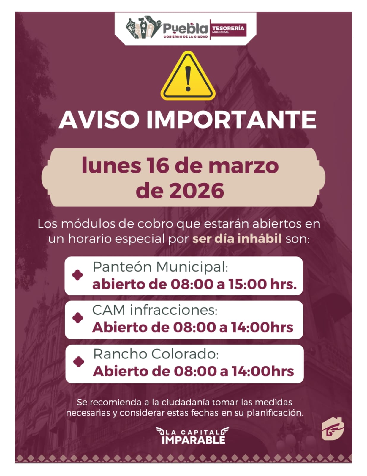 El Gobierno de la Ciudad, que encabeza el alcalde Pepe Chedraui, a través de la Tesorería Municipal, se informa que los módulos de cobro estarán abiertos en un horario especial el lunes 16 de marzo por ser día inhábil.