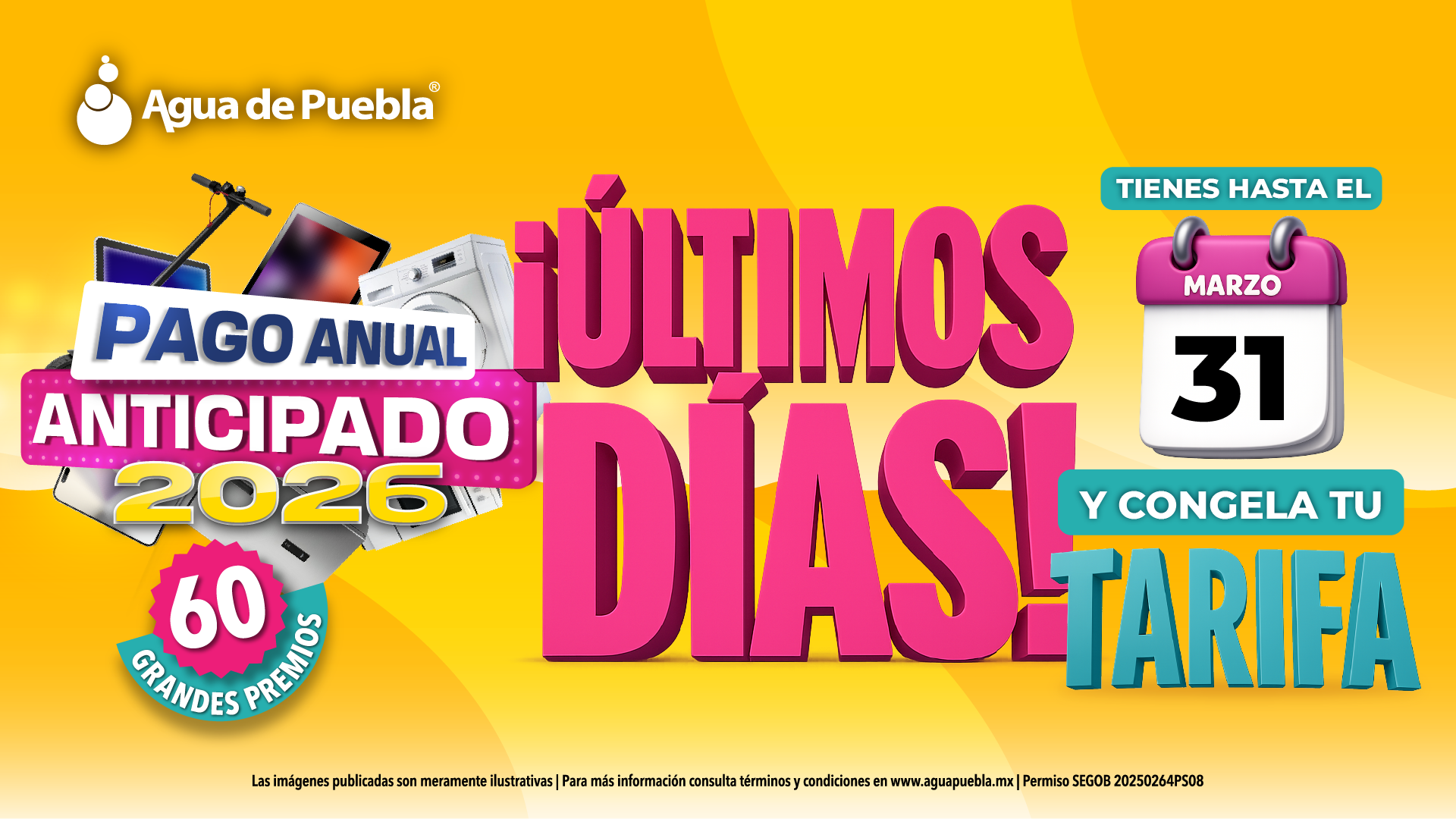 Agua de Puebla informa que el próximo 31 de marzo vence el plazo para aprovechar los beneficios del Pago Anual Anticipado 2026 y mantener las tarifas actuales vigentes para todo el año 2026, además de participar en el segundo sorteo del próximo 6 de abril.