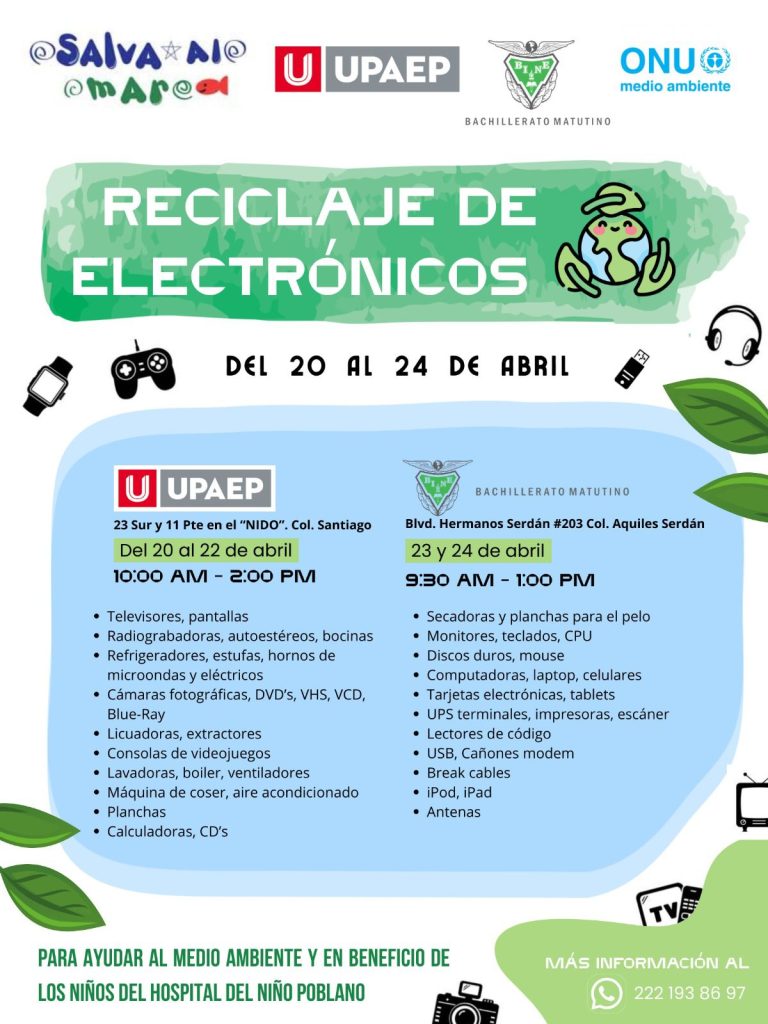 Las personas pueden llevar sus residuos electrónicos a la UPAEP del 20 al 22 de abril, entre 10:00 a. m. y 2:00 p. m., y al BINE del 23 al 24 de abril, entre 9:30 a. m. y 1:00 p. m.