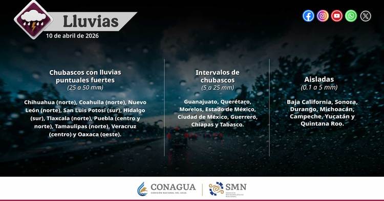 Chubascos con lluvias puntuales fuertes (25 a 50 mm): Chihuahua (norte), Coahuila (norte), Nuevo León (norte), San Luis Potosí (sur), Hidalgo (sur), Tlaxcala (norte), Puebla (centro y norte), Tamaulipas (norte), Veracruz (centro) y Oaxaca (oeste).