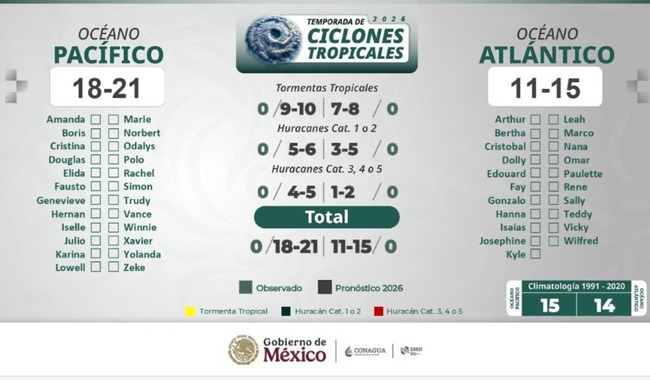 Precisó que en el Pacífico se prevé el desarrollo de entre 18 y 21 ciclones tropicales con nombre, de los cuales de 9 o 10 serían tormentas tropicales, 5 o 6 huracanes categorías 1 o 2 y 4 o 5 huracanes mayores (categorías 3, 4 o 5). En el océano Atlántico, se estima la formación de entre 11 y 15 sistemas con nombre, de los cuales de 7 u 8 serían tormentas tropicales, de 3 a 5 huracanes categorías 1 o 2 y 1 o 2 huracanes mayores.